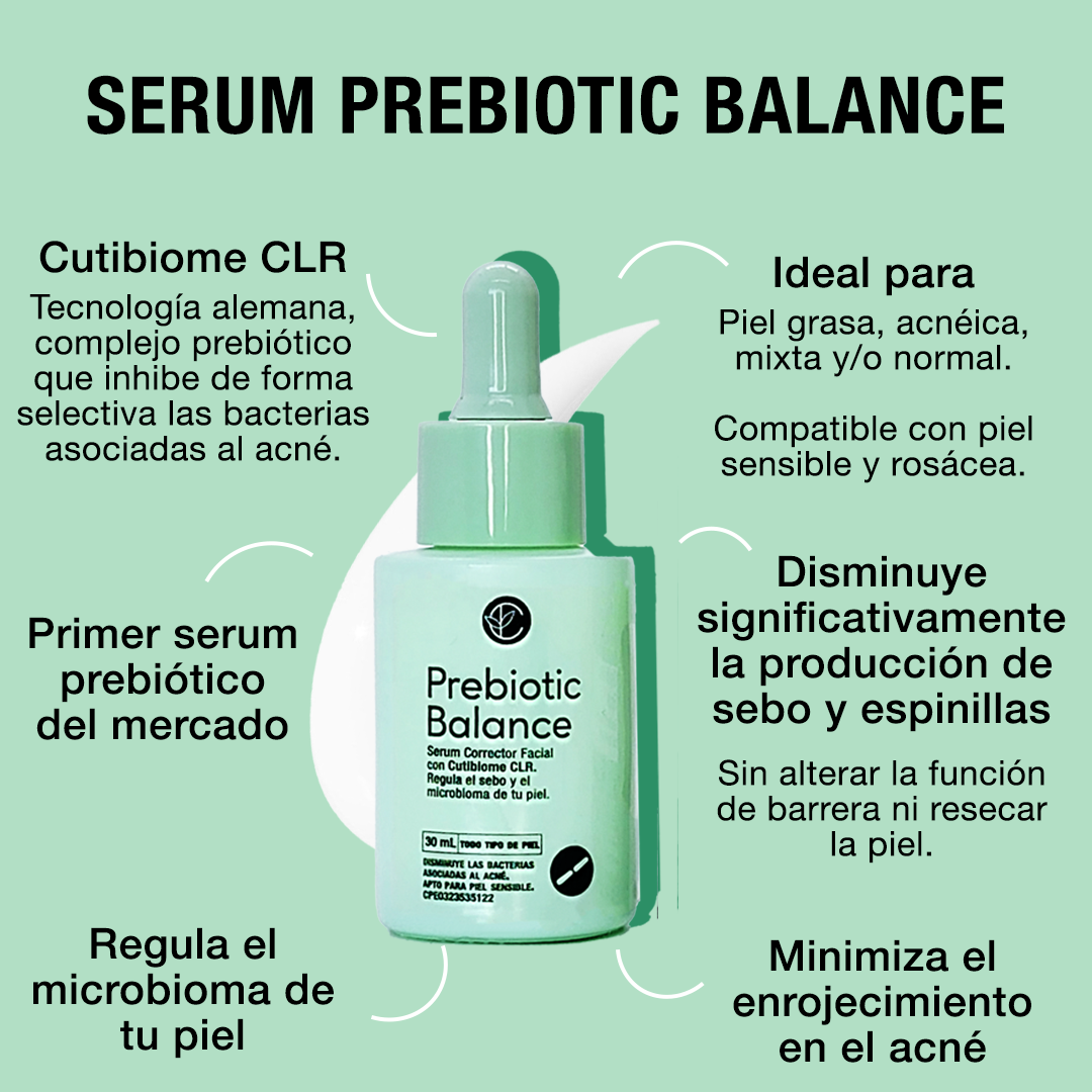- Aplica tu serum Prebiotic Balance para equilibrar la microbiota de tu piel, proporcionando una tez más saludable y radiante mientras reduces las bacterias asociadas al acné.